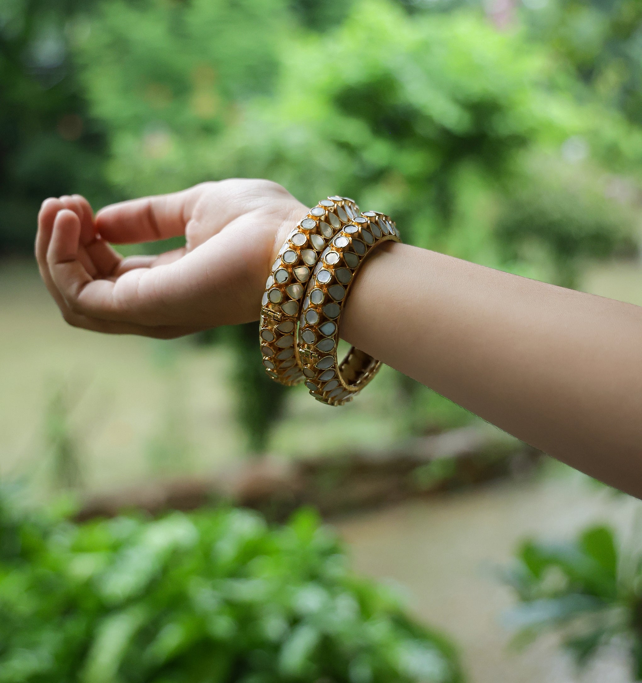 Muraad is synonymous to Mother of Pearl as our love and celebration of jewels began with this beautiful technique of crafting jewellery from gem stones. With Mother of Pearl as our forte, we have created thousands of designs with gemstones set in silver foil for the bright shine and fire , brass to hold them together and gold plated all over to make heirloom inspired Indian jewels available and accessible as affordable luxury.