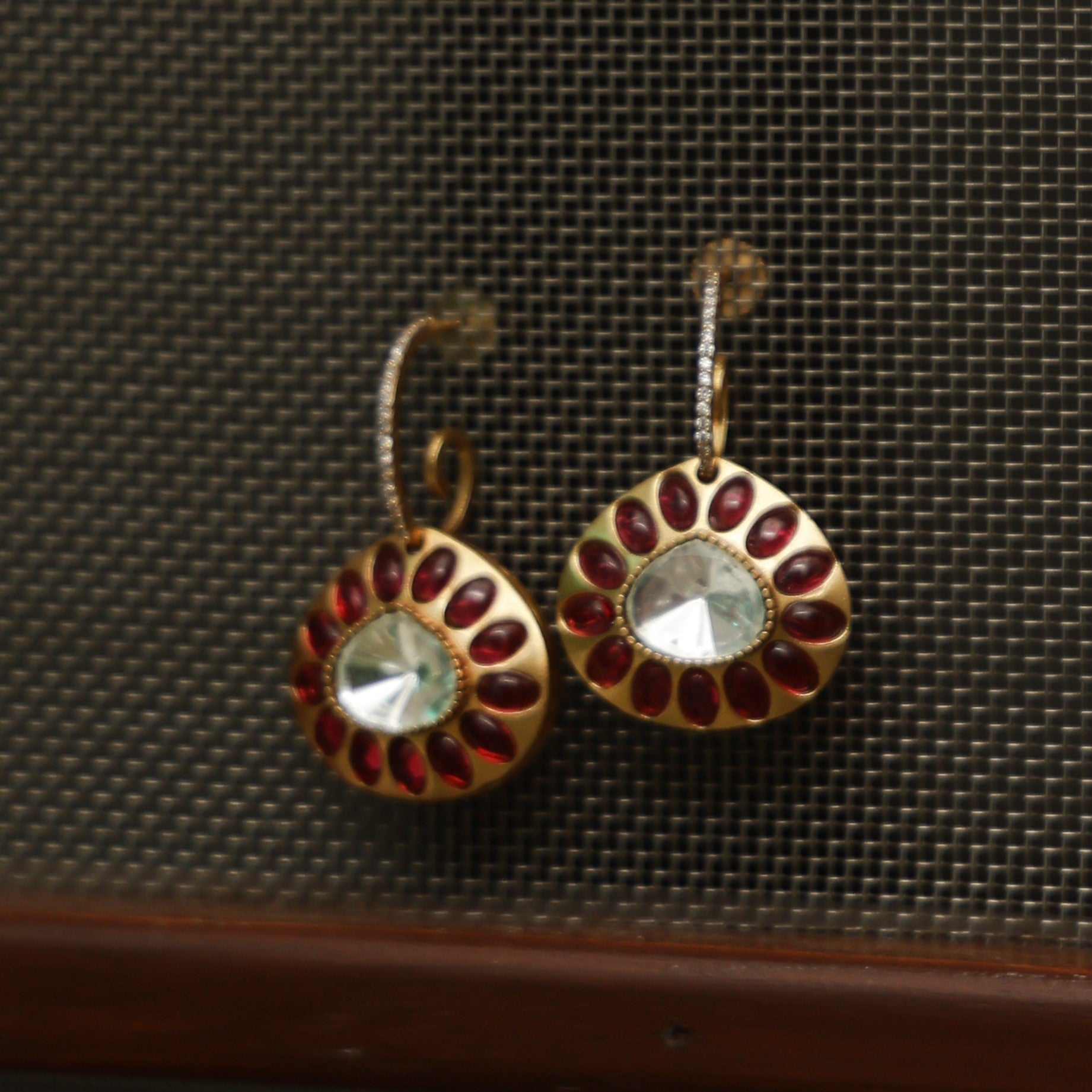 MDE798- Ruby Colour Gold Plated Faux Polki Double Sided Dangler Earrings